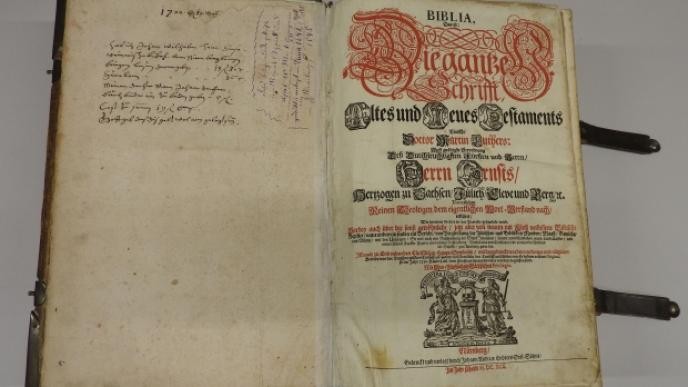 Im Bestand des Besigheimer Stadtarchivs befindet sich eine große prachtvoll ausgestattete Kurfürstenbibel aus dem Jahr 1692, die in der Buchdruckerei Endter in Nürnberg gefertigt wurde und den wortreichen Titel trägt: