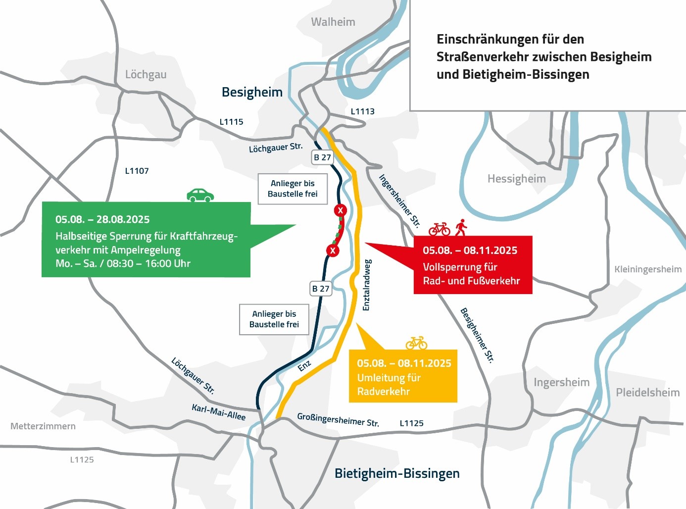 - Der Fußgänger- und Fahrradverkehr entlang der B27 zwischen Besigheim und Bietigheim-Bissingen wird ab Dienstag, 5. August bis Samstag, 8. November 2025 über den Enztalradweg umgeleitet. Die Umleitung wird ab dem 5. August ab 12:00 Uhr vor Ort ausgewiesen.