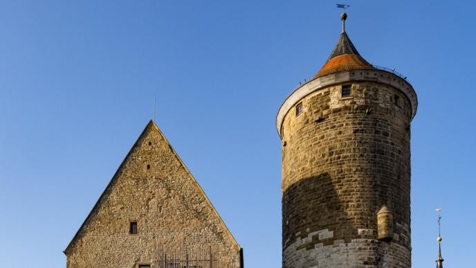 Der Schochenturm wurde, wie auch der Waldhornturm, um 1220 erbaut. Der Turm ist 31 Meter hoch und hat seinen Zugang im zweiten von insgesamt 5 Gewölben. 1312 versteckte sich Graf Eberhard der Erlauchte von Württemberg in diesem Turm. Den Namen Schochenturm hat der Turm von einem ehemaligen Turmwärter Namens Schoch erhalten.