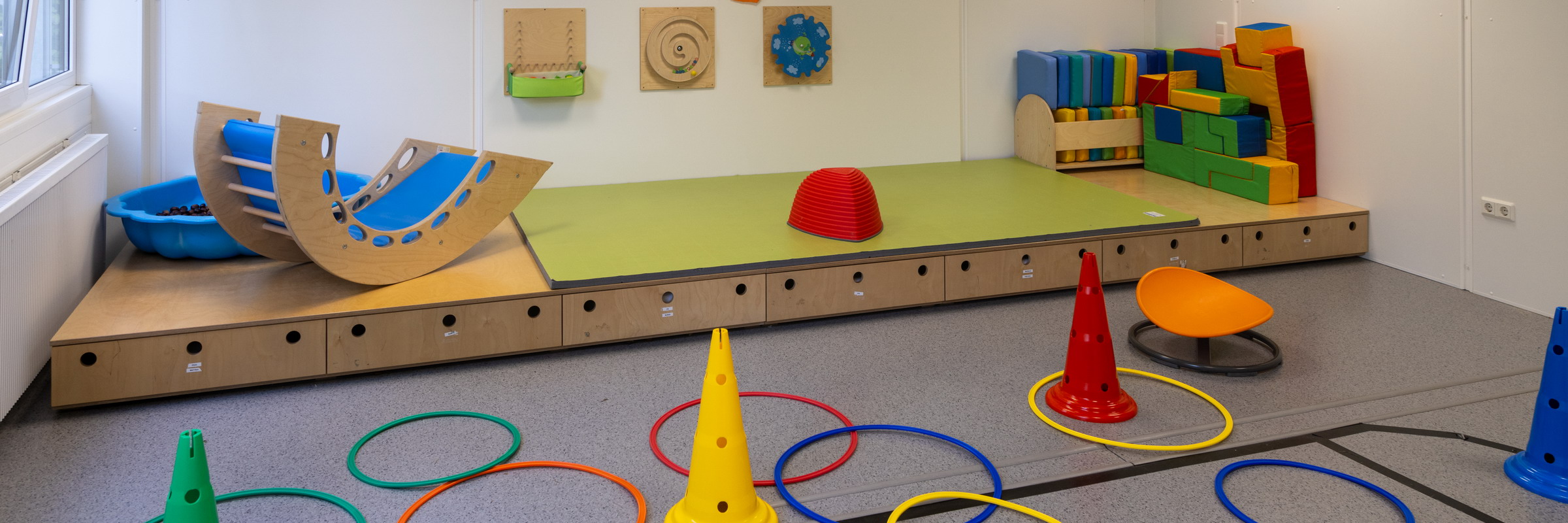 Im Erdgeschoss des Gebäudes befinden sich sowohl Gruppen- und Sanitärräume, ein Wickelraum, ein Funktionsraum sowie die Küche.