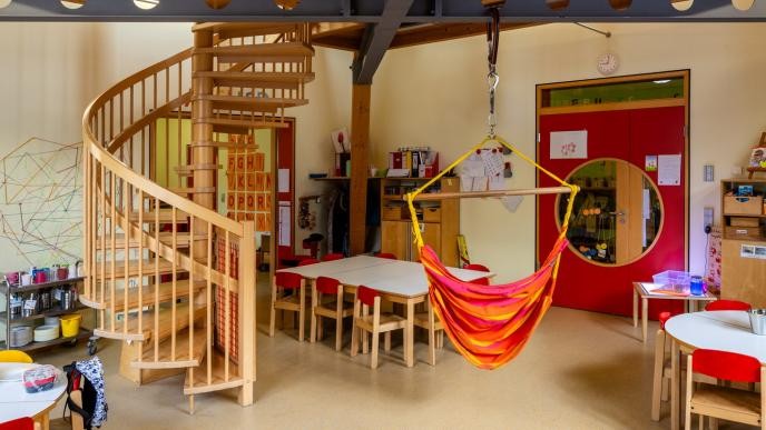 - 2 Gruppenräume mit zweiter Ebene und verschieden Funktionsbereichen(Rollenspielbereich, Bau- und Konstruktionsbereich, Lese- und Ruhe Ebene, Spieletisch, Kreativbereich und ein Bistro)